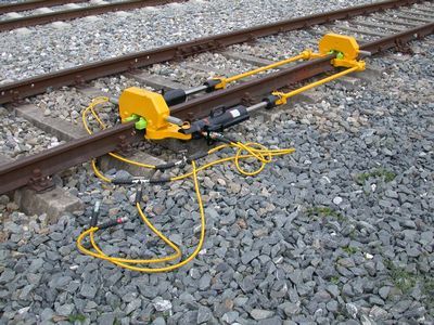 钢轨焊接时液压无阻碍的钢轨紧固器 在焊接和不起作用的时候绷紧 无工具时候快速安装 质轻的结构-最重部件才33 kg 可在两个钢轨上并行操作 可配合手泵或液压动力装置使用